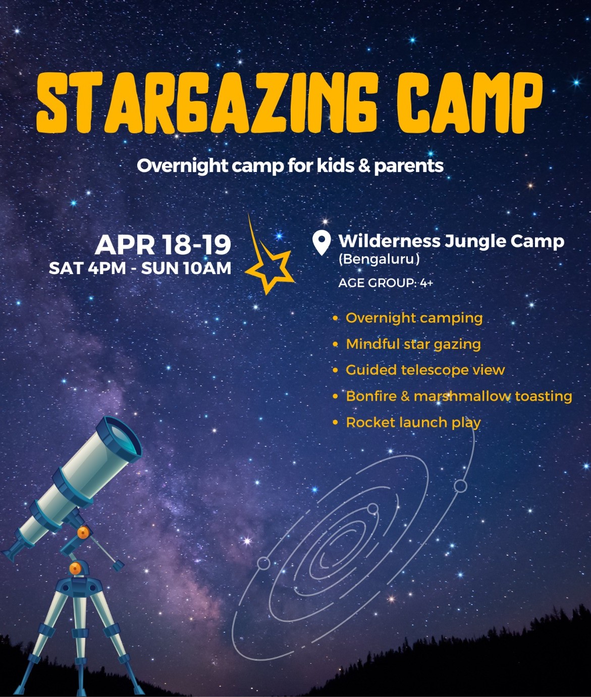 This is an invitation to slow down, look up, and feel small—in the best possible way. At this stargazing camp, children and parents will experience the night sky the way humans have for thousands of years — with naked eyes, curiosity, and calm presence. Led by an Astrophysicist, we will gently explore: How to observe the night sky without instruments Spotting the North Star Identifying a few basic planets and star patterns Simple ways to differentiate stars and planets (No jargon. No pressure to “learn”.) There will be a dedicated quiet sky-watching time, where everyone simply lies back, watches the stars, and soaks in the vastness above. We will also use: One basic telescope to view a few celestial objects A smart sky-viewing device for quick, assisted viewing (especially exciting for kids) 🌙 What Makes This Experience Special ✨ Mindful & child-friendly – designed for young kids and first-time stargazers ✨ No prior knowledge required – curiosity is enough ✨ Shared family experience – parents learn alongside children ✨ Balance of calm + fun – silence, stories, movement, and play 🚀 Activities Included 🌌 Guided naked-eye stargazing 🤫 Silent sky observation time 🔭 Telescope viewing (short & guided) 🎥 A short, child-friendly space documentary ❓ Fun quiz & conversations around space 🚀 Morning rocket launch pretend-play activity (toy-based, just for fun!) 👨👩👧👦 Who Is This For? Young children (especially early explorers) Parents who want a non-academic, meaningful nature experience Families new to stargazing Anyone who simply wants to feel wonder again 👉 Perfect if you’ve ever thought: “I don’t know much about stars, but I want my child to experience the night sky.” 🌿 What This Is NOT ❌ Not a technical astronomy class ❌ Not heavy on scientific terminology ❌ Not focused on advanced telescope usage This is about connection, awe, and being present under the sky together. Because wonder begins with looking up ! *Check-in* - Saturday @ 4 pm *Checkout* - Sunday@10 am *Location* - Wilderness Jungle camp https://maps.app.goo.gl/ggHYWEyfp3m4qDye6?g_st=iw